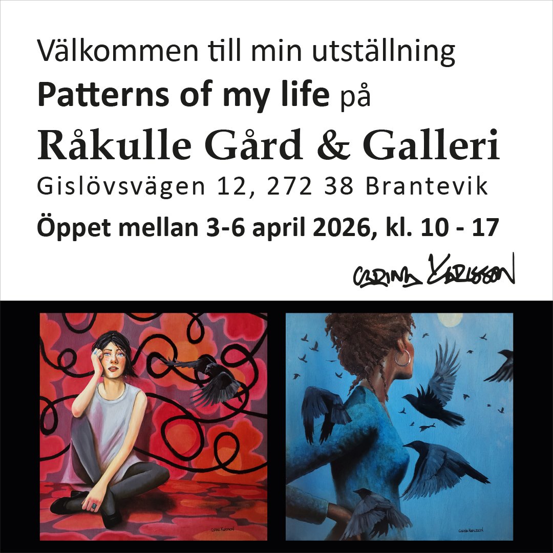 Carina Karlsson är en konstnär från Göteborg, som visar utställningen "Patterns of my life". En serie oljemålningar laddad med färg och mönster, i realistisk stil.
